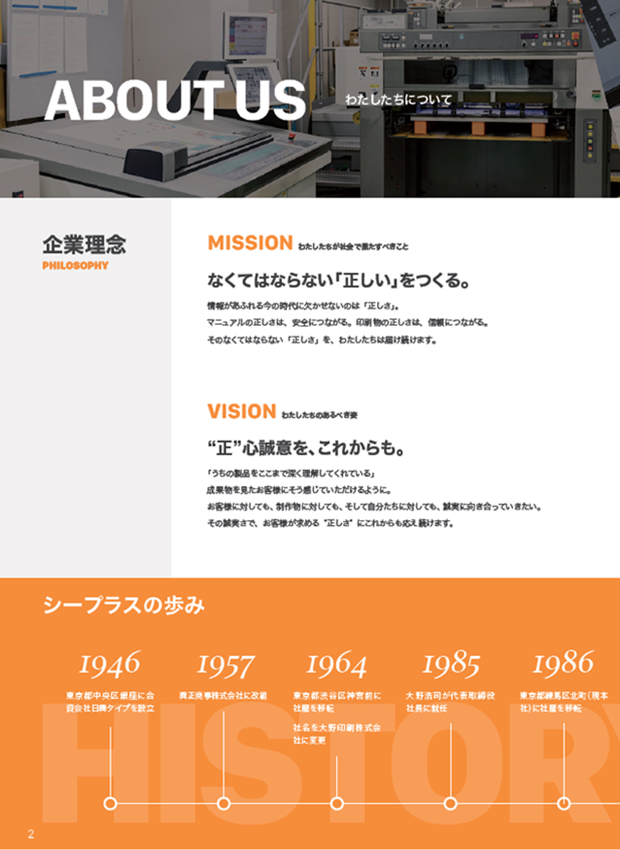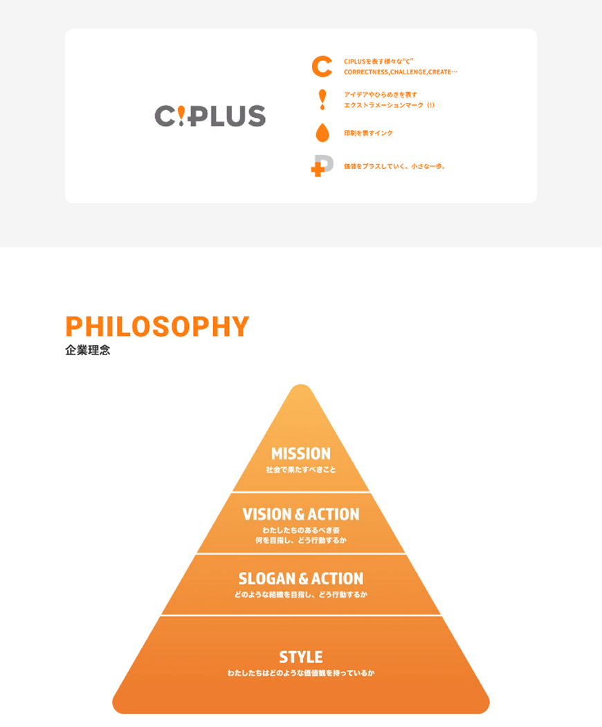 「大野印刷」という社名から「シープラス」へ変更。企業イメージも刷新するべく、従業員を絡めたワークショップから企業理念の策定、ツール制作まですべて一貫して行った。