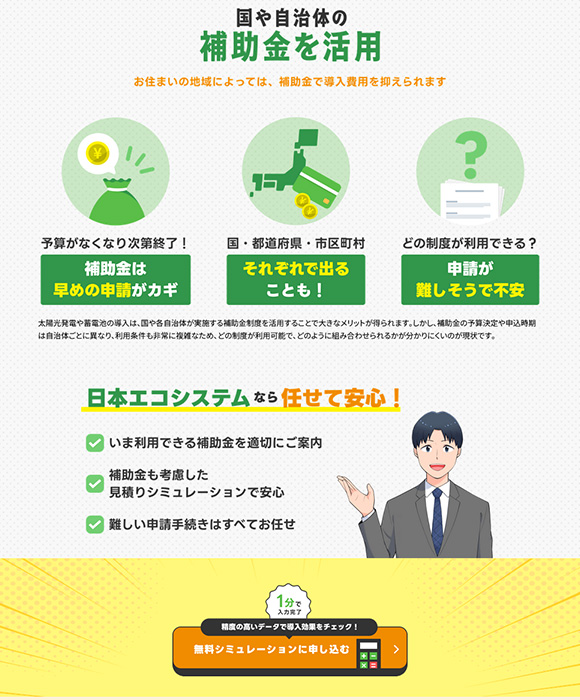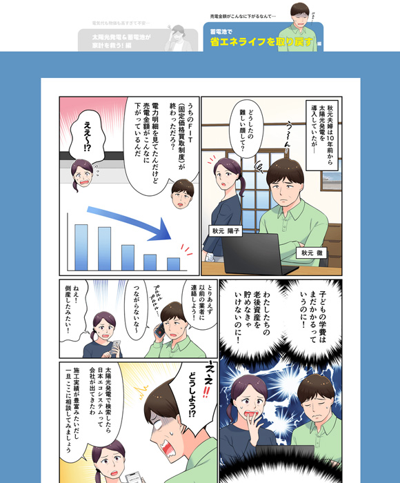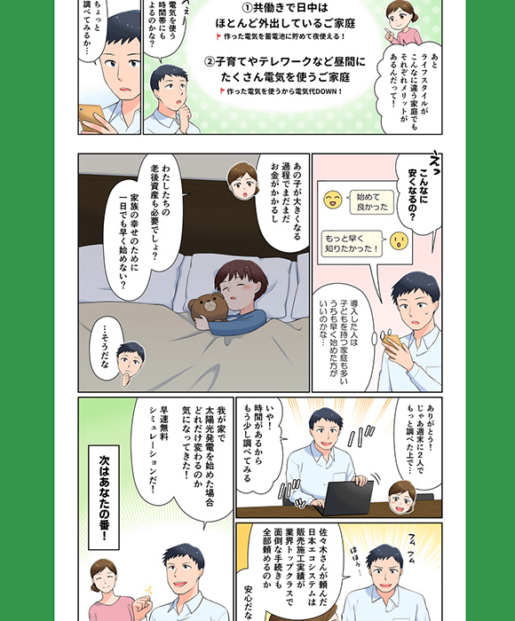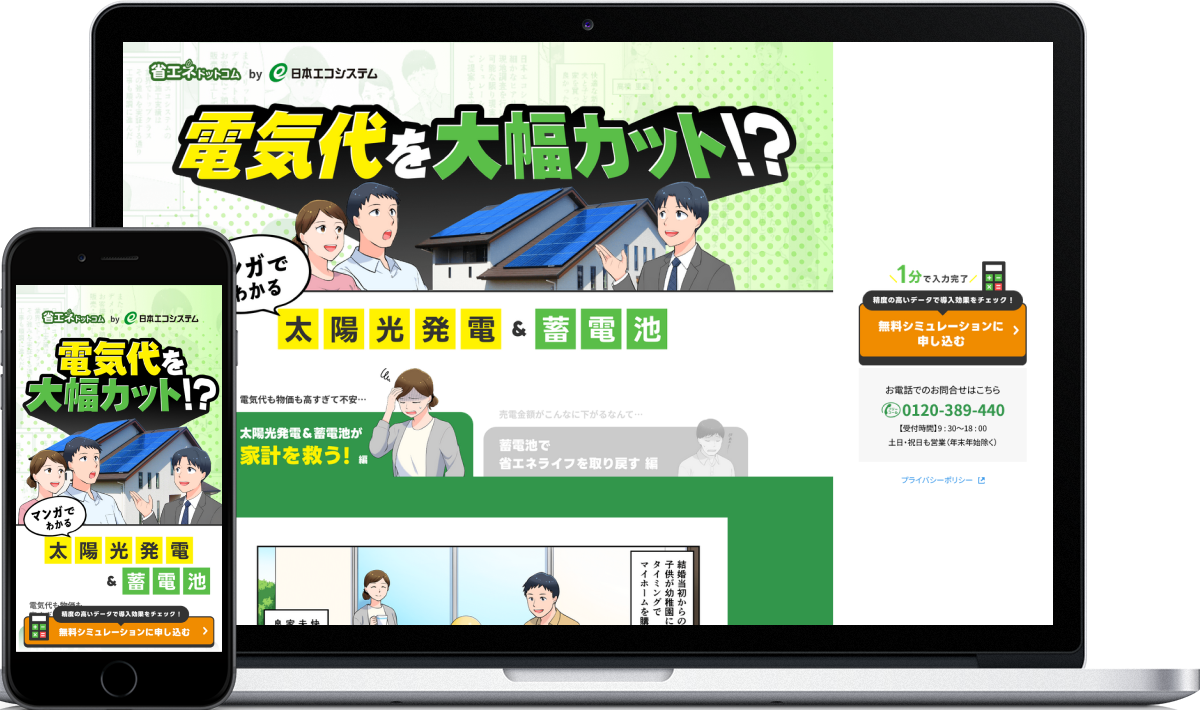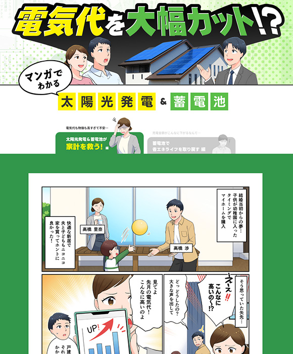 太陽光発電という商材をより分かりやすく、ハードルを下げて訴求できるよう漫画を使ったLPを作成。蓄電池とのセット購入と蓄電池単体で購入するターゲットに向けて2種類の漫画をタブで切り替えられる仕組みに。