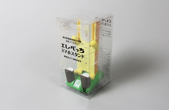 企業キャラクターの「エレべっち」をモチーフにスマートフォンスタンドの素材をポリレジンで制作し、試作品で印刷の色味やスタンドの安定性、スマートフォンを置いたときの角度などの検証も行いました。
