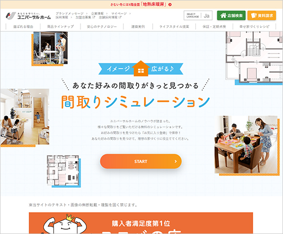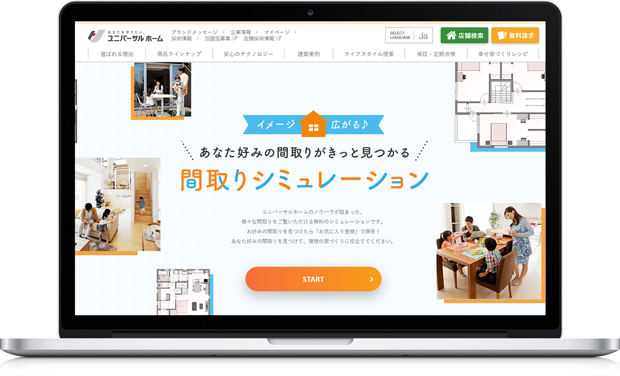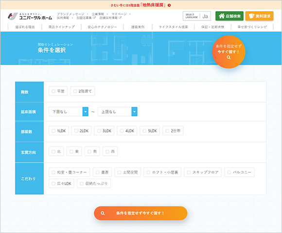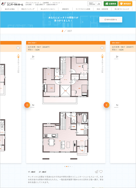 オフィシャルサイトの来訪者に対して家を建てる上での間取りイメージの具体化を疑似体験頂くために、間取りシミュレーションコンテンツを制作。様々な条件を追加していくと絞り込みが行え理想の間取りにたどり着ける仕様。